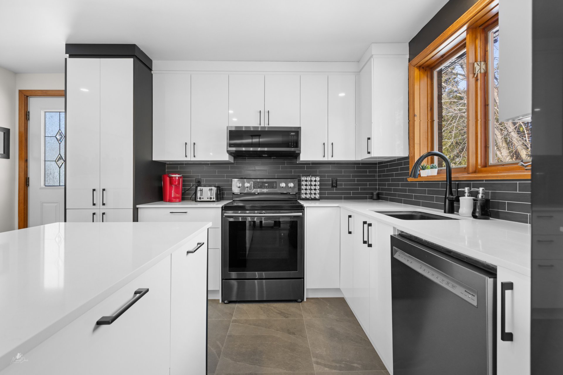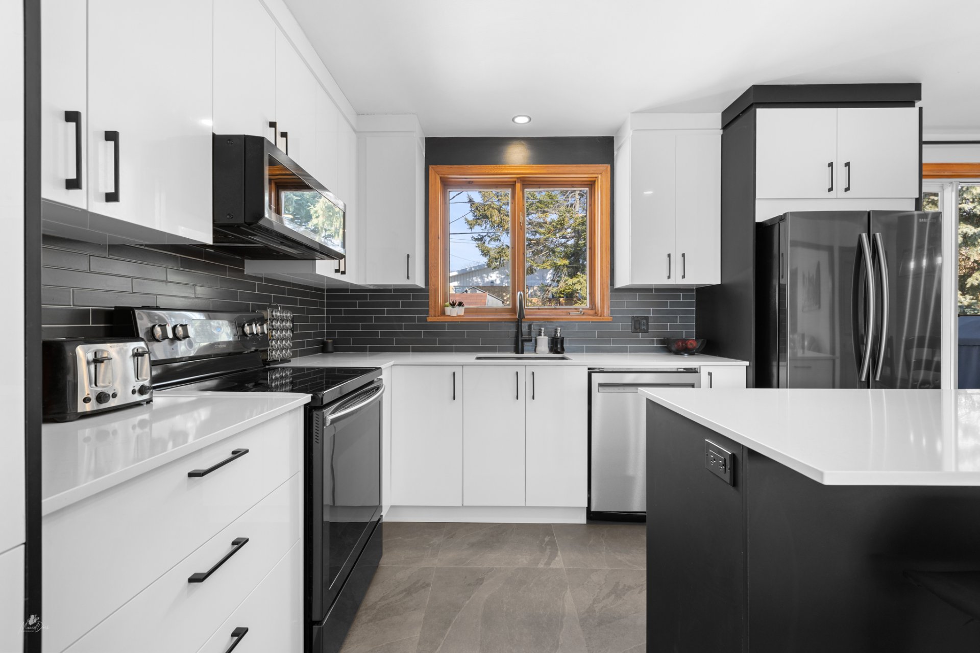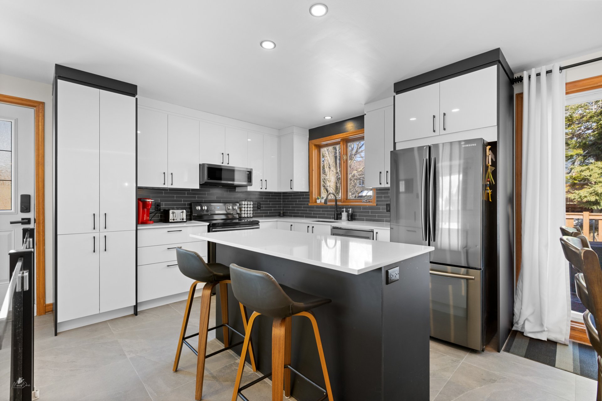 Luminaires, hotte micro-onde, habillage des fenêtres.