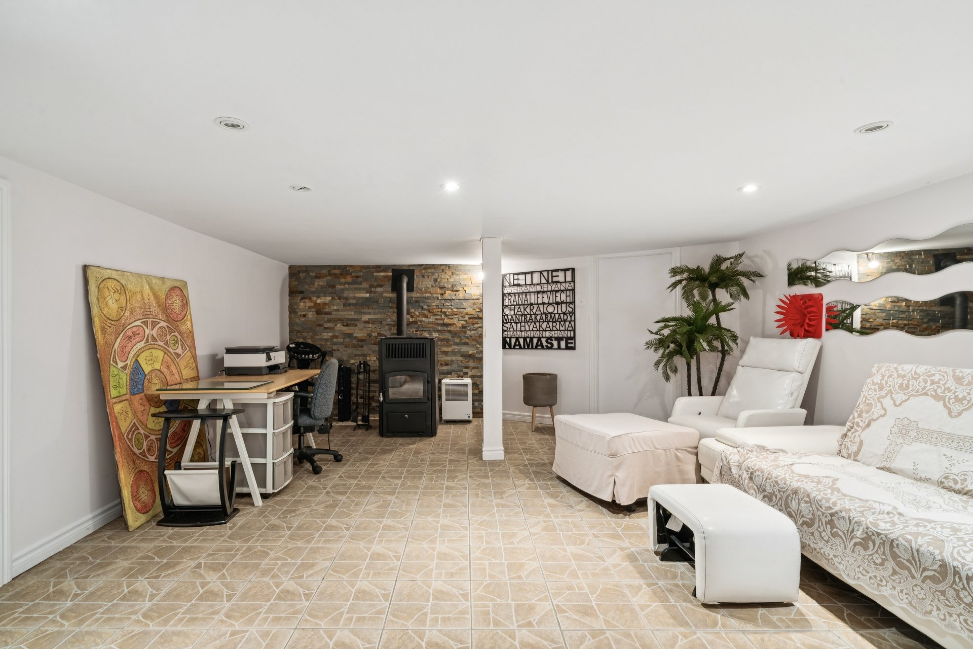 Génératrice, sofa dans le sous-sol, poêle à granules, stores, rideaux, luminaires, 2 chaises de bar