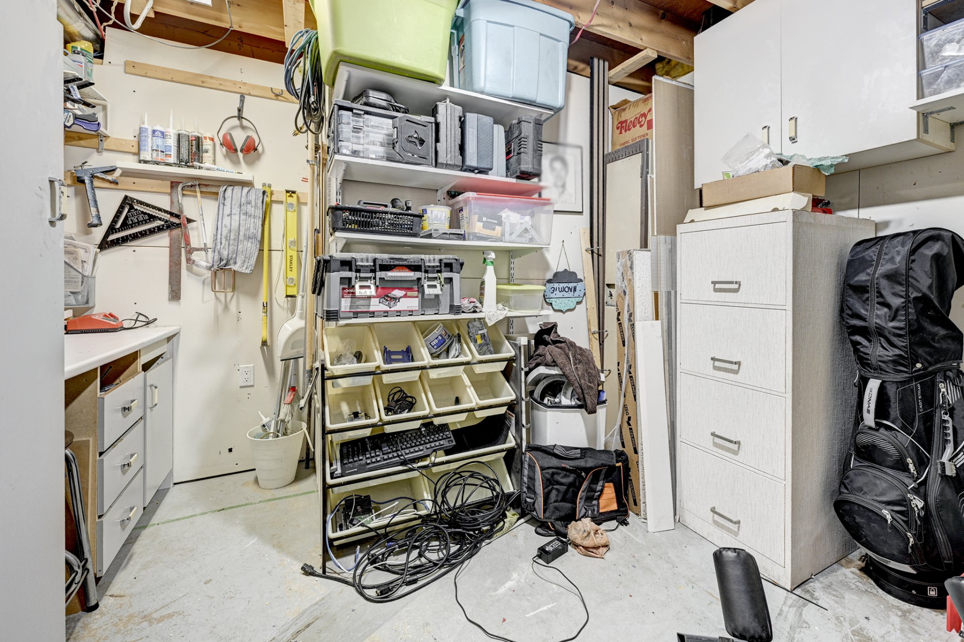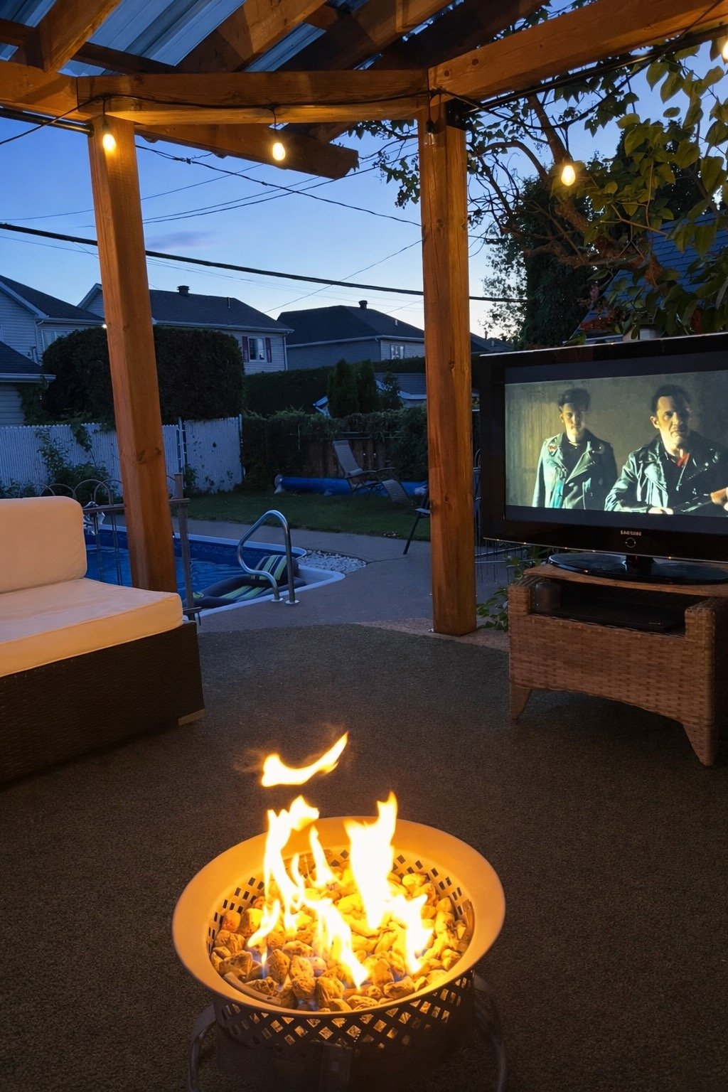 pôles et rideaux, piscine et accessoires thermopompe, meuble du sous-sol, banc bleu, armoire en coin, rack rdc (chambre principale et sous-sol), balayeuse centrale