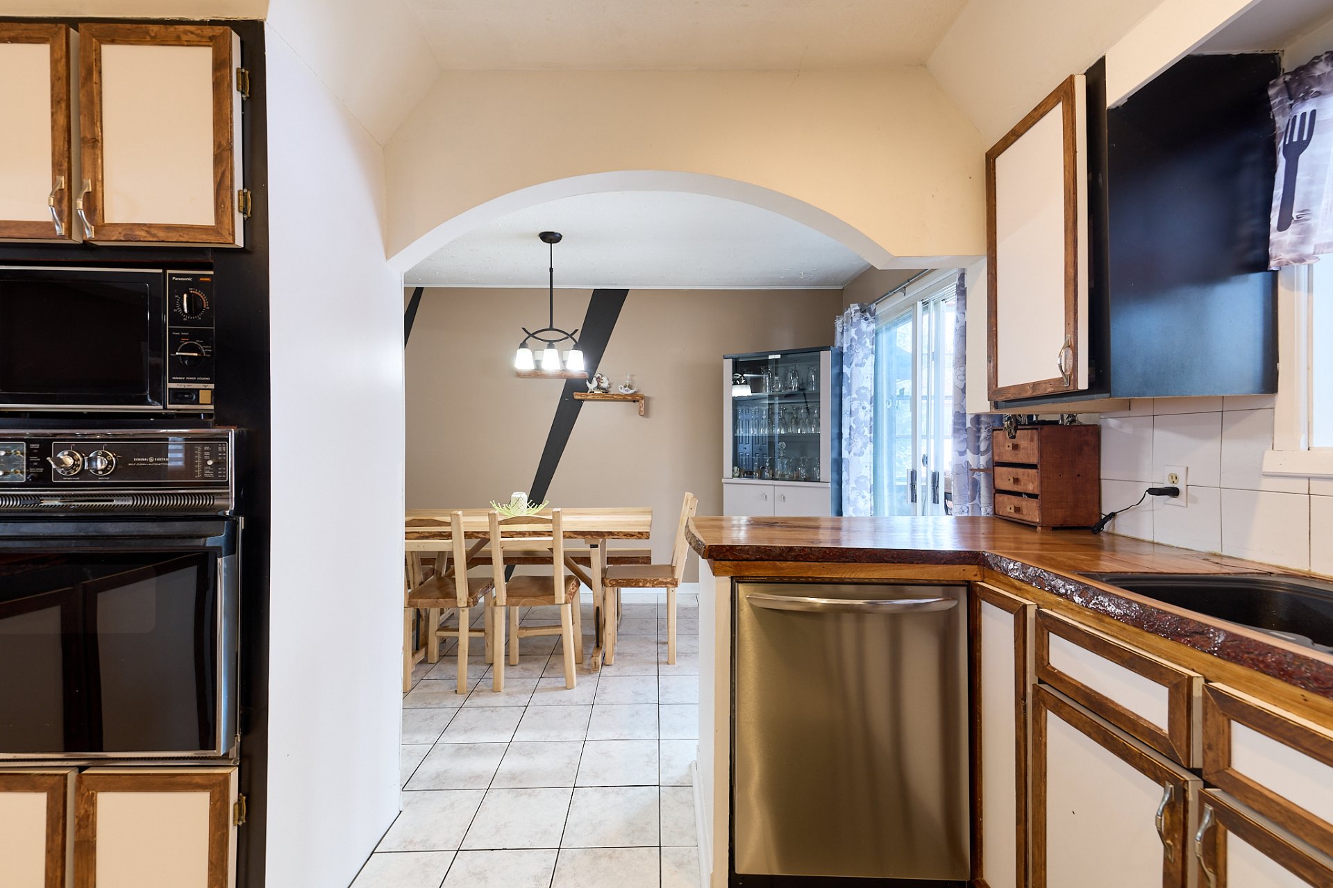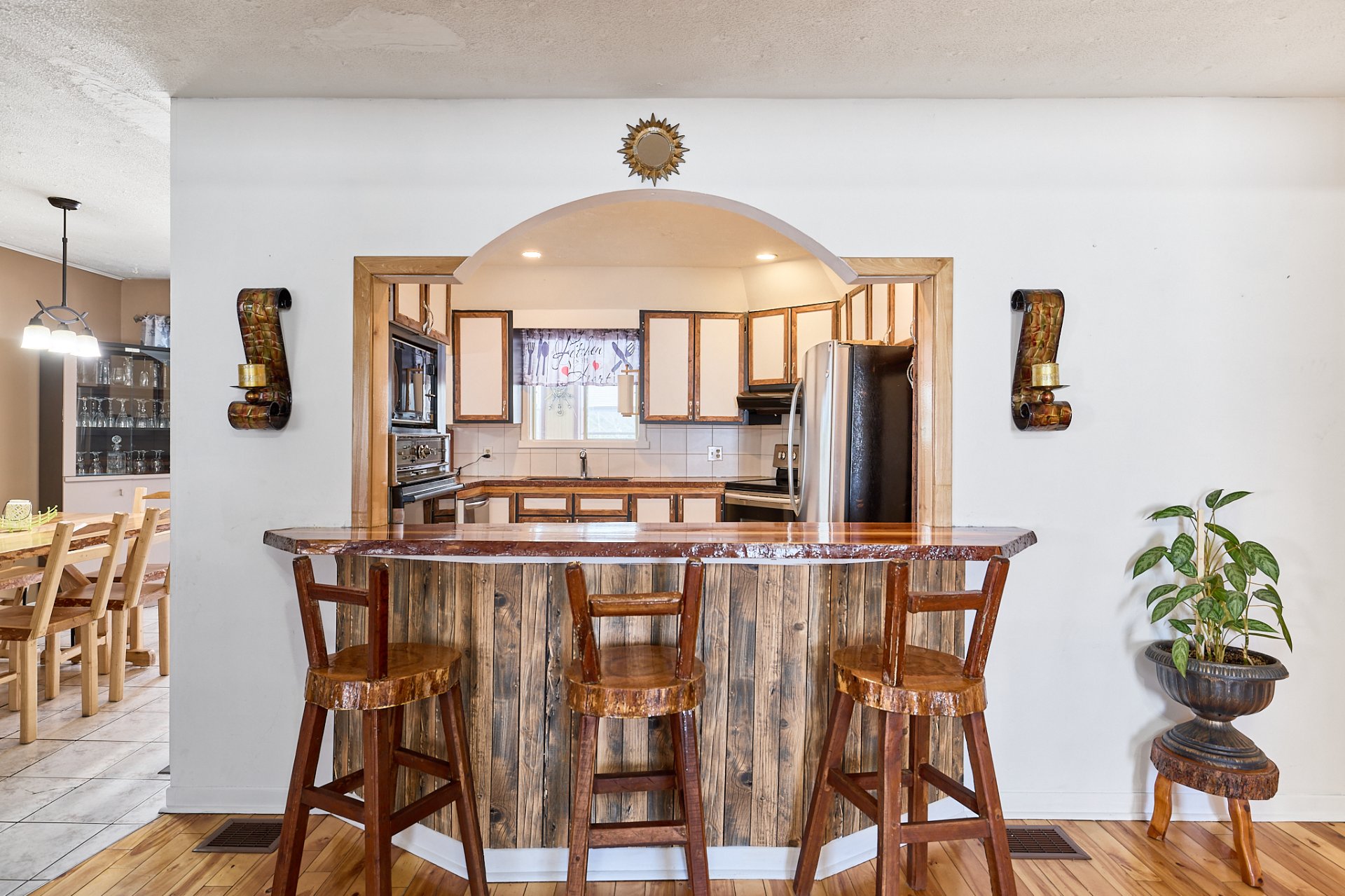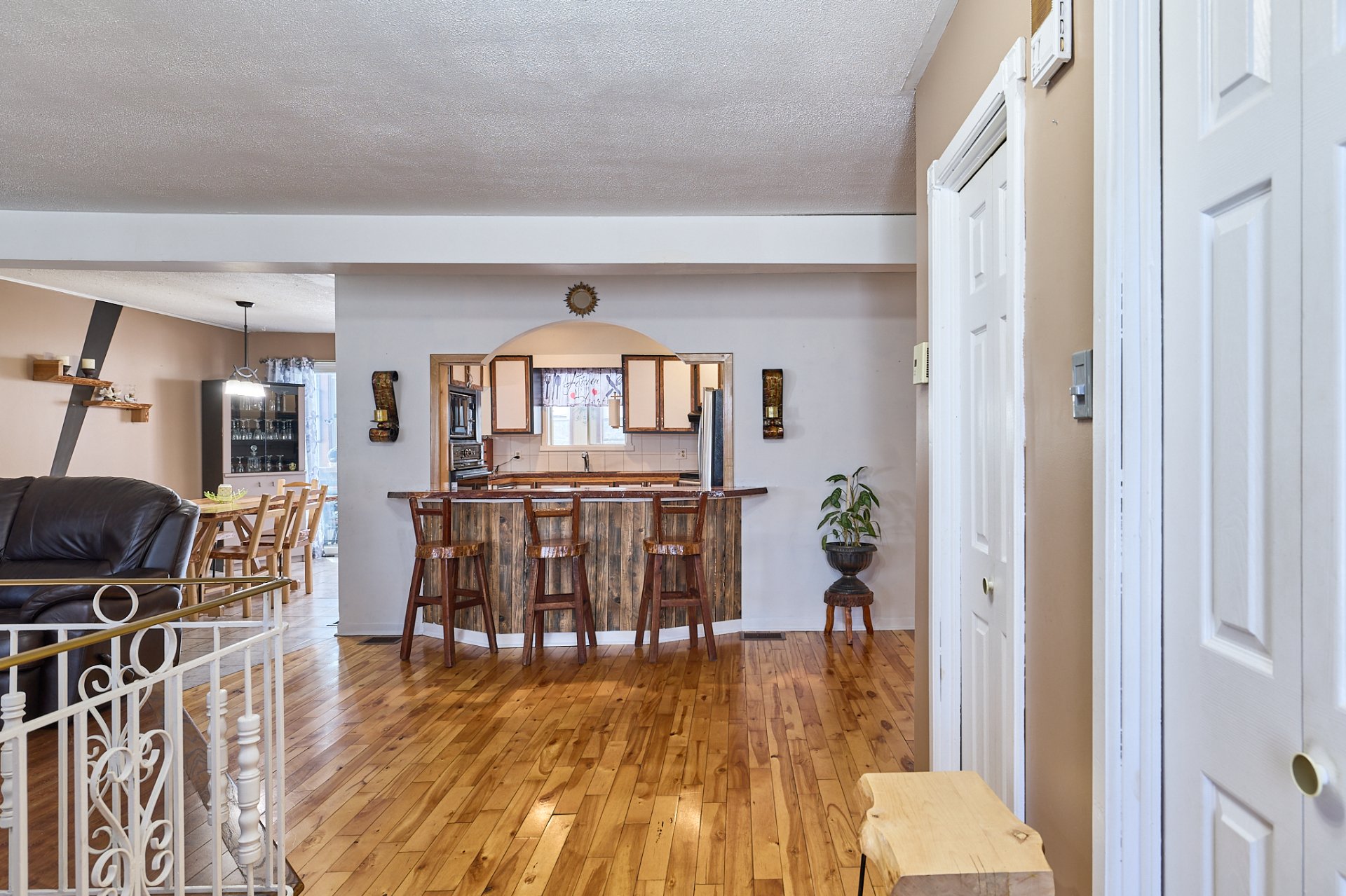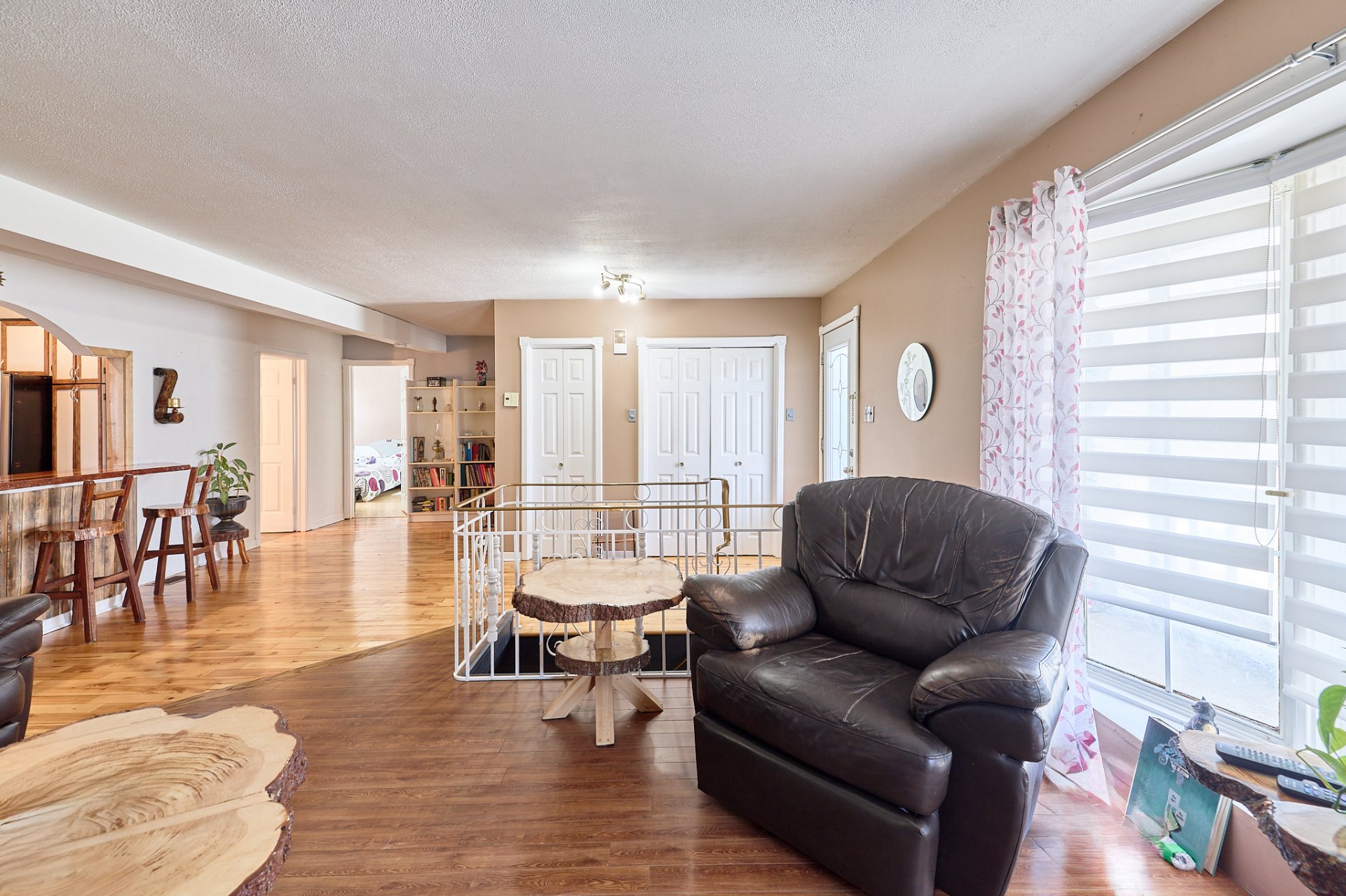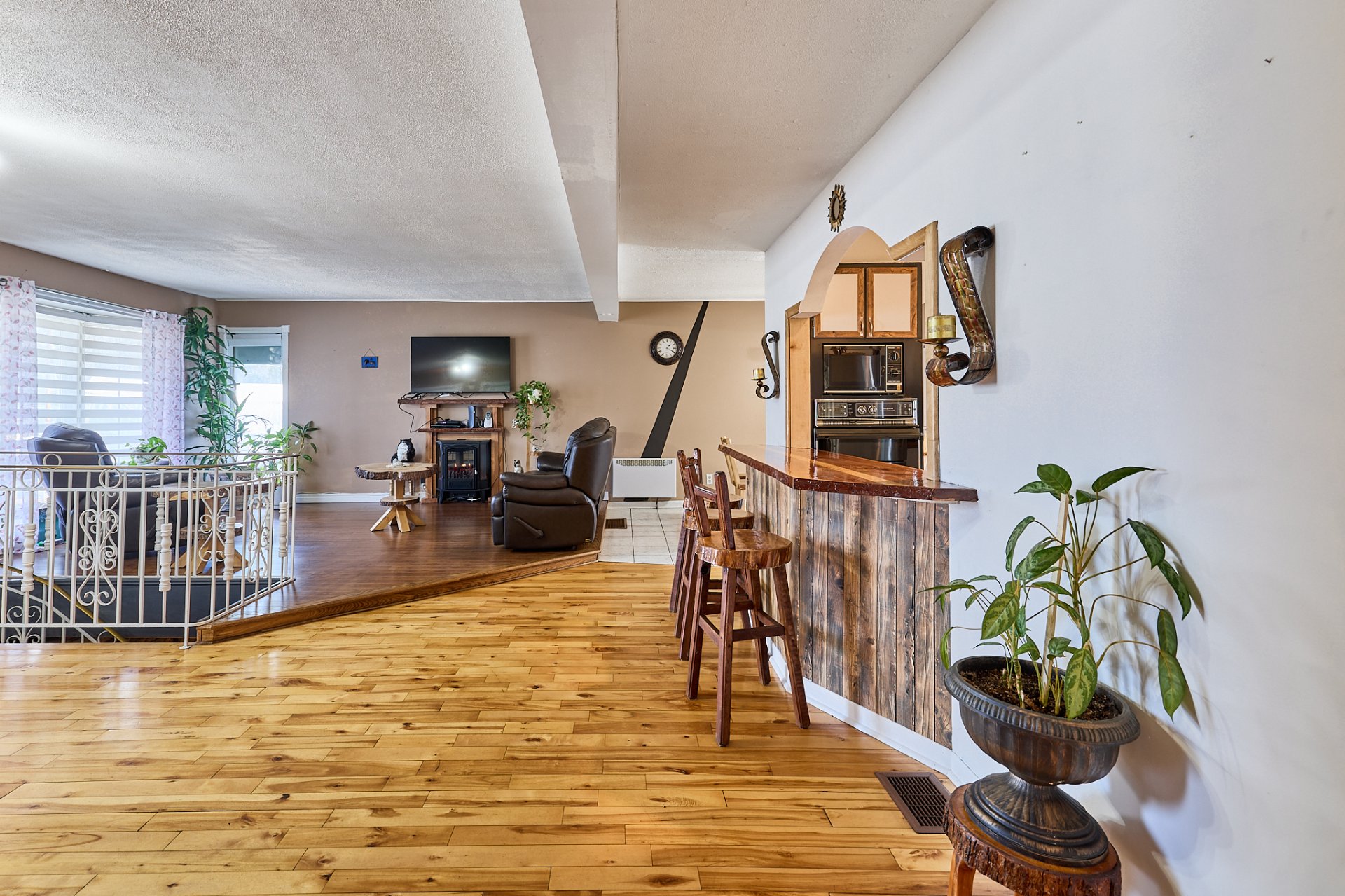 luminaires, stores, pôles, rideaux, four encastré, foyer électrique du salon,(tous vendus et laissés sans garantie légale de qualité aux risques et périls de l'acheteur) banc de comptoir, tablettes sur le mur de la salle à manger.