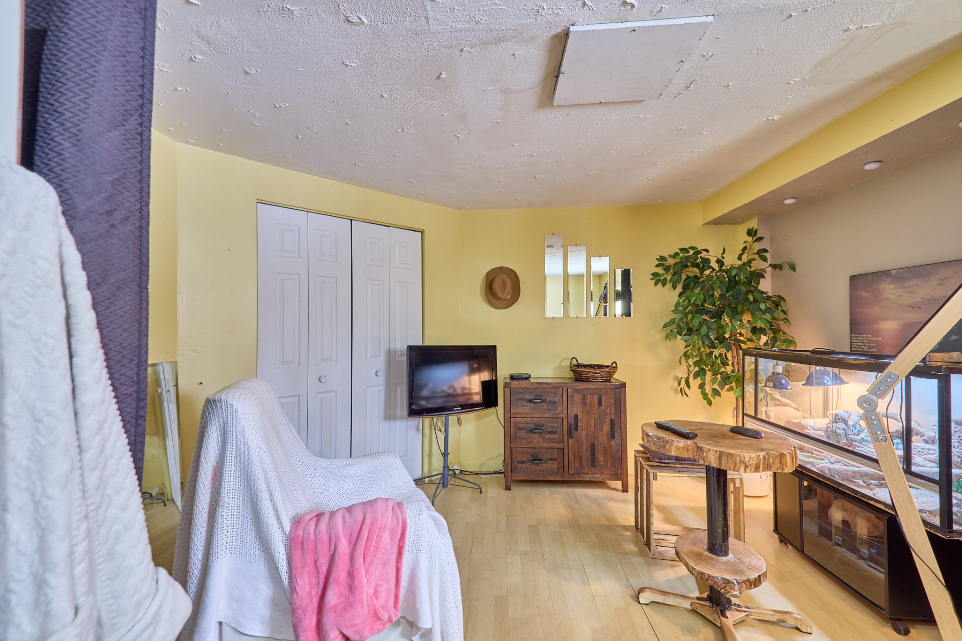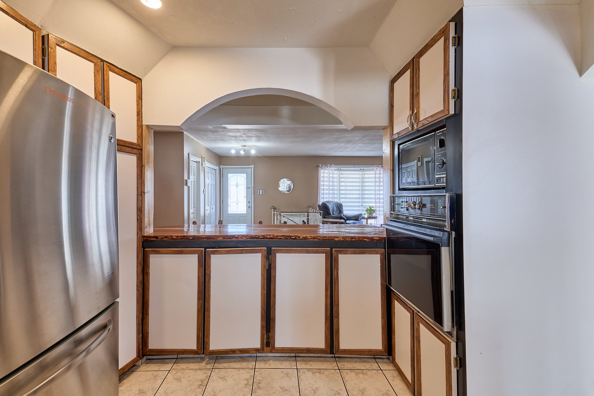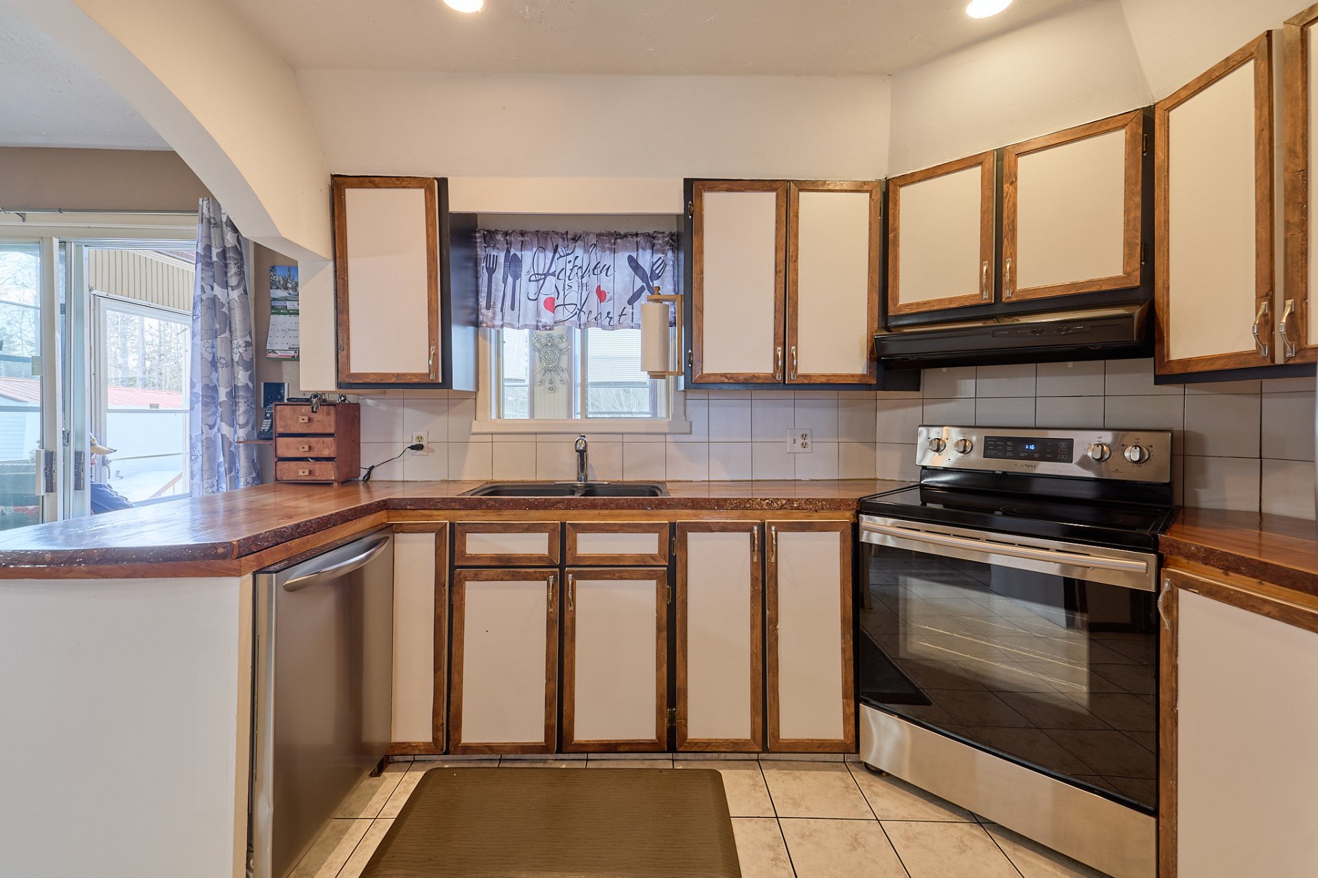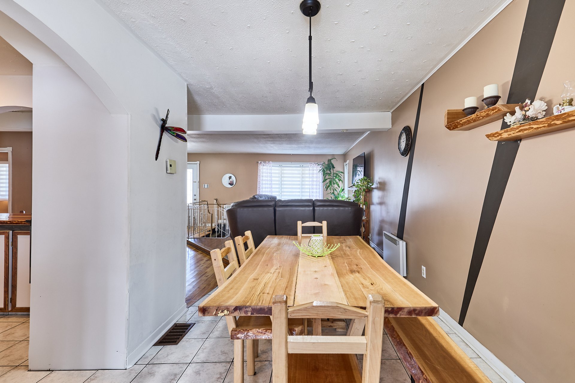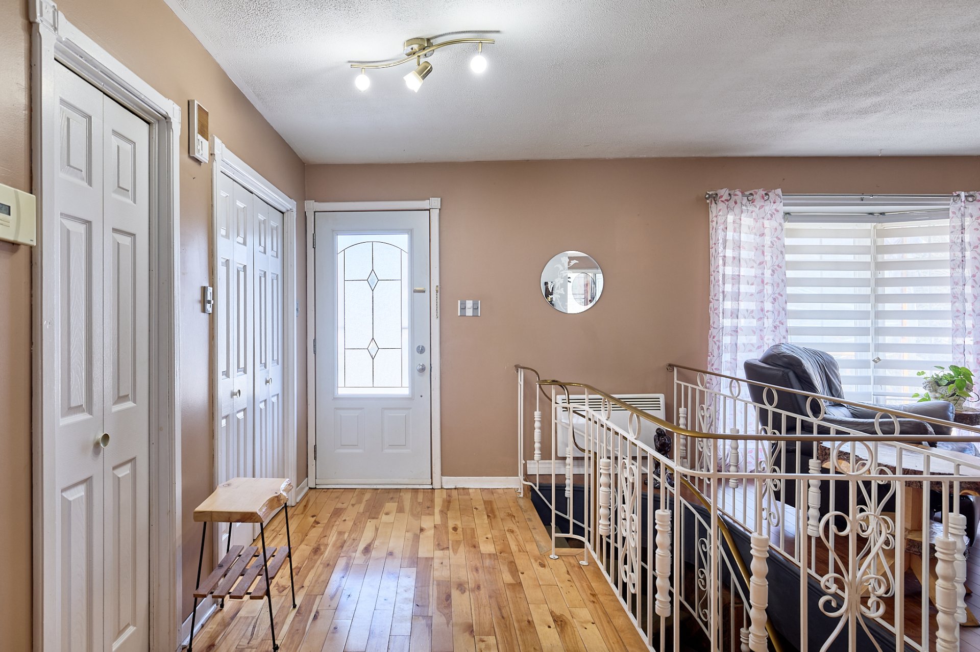 luminaires, stores, pôles, rideaux, four encastré, foyer électrique du salon,(tous vendus et laissés sans garantie légale de qualité aux risques et périls de l'acheteur) banc de comptoir, tablettes sur le mur de la salle à manger.