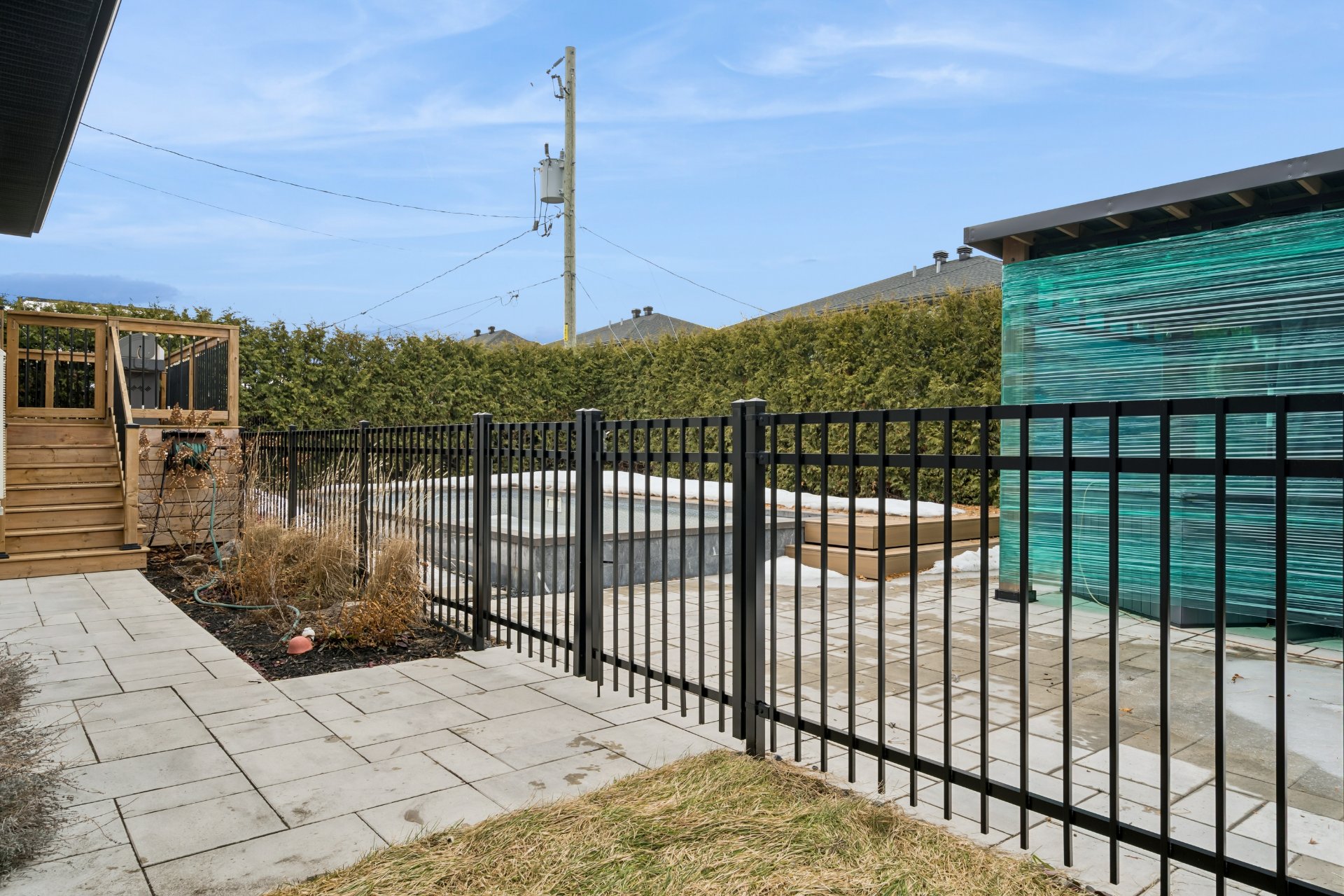 Aménagement du terrain Clôturé, Patio, Paysager, Terrain/cour bordé de haies