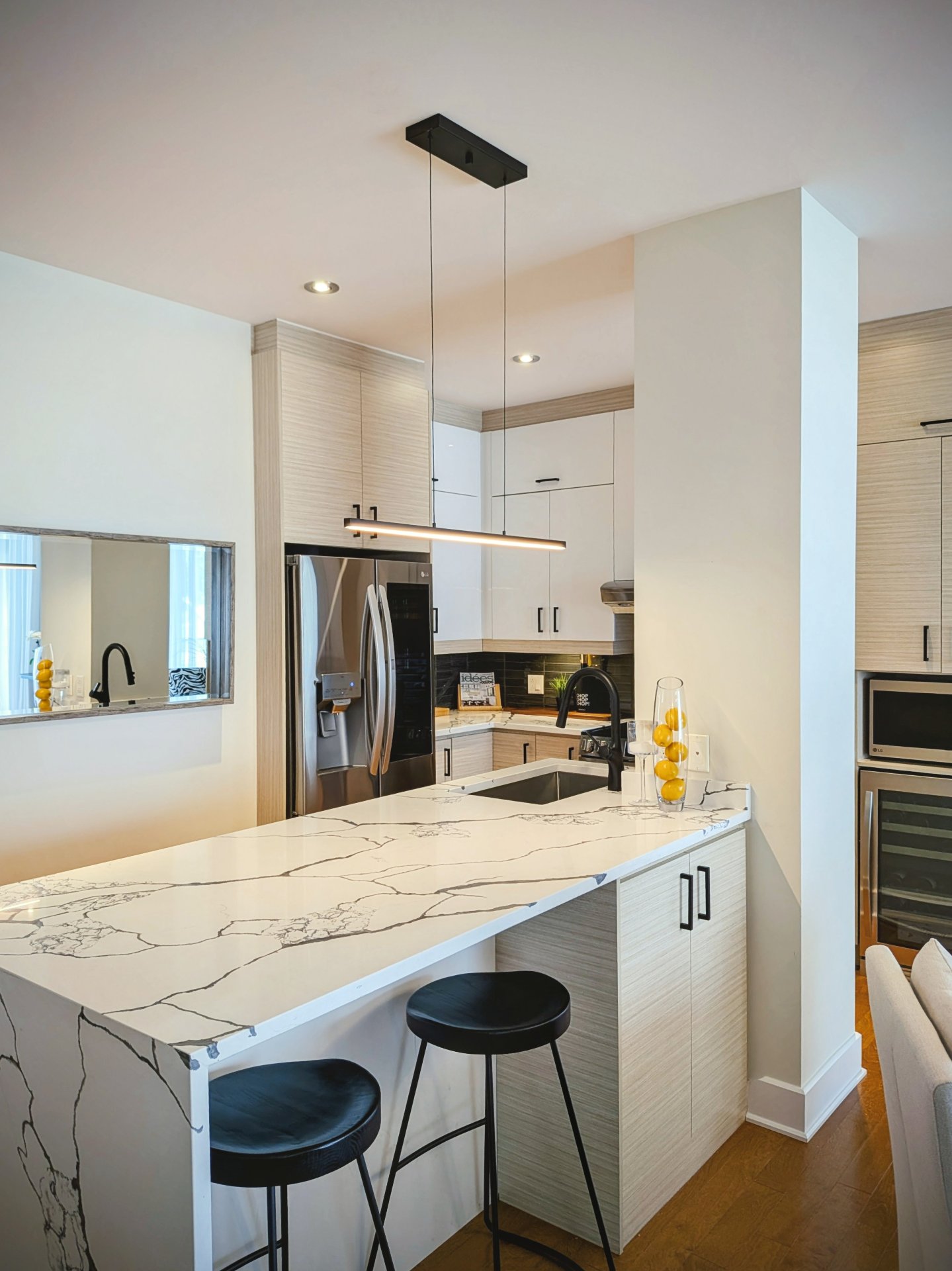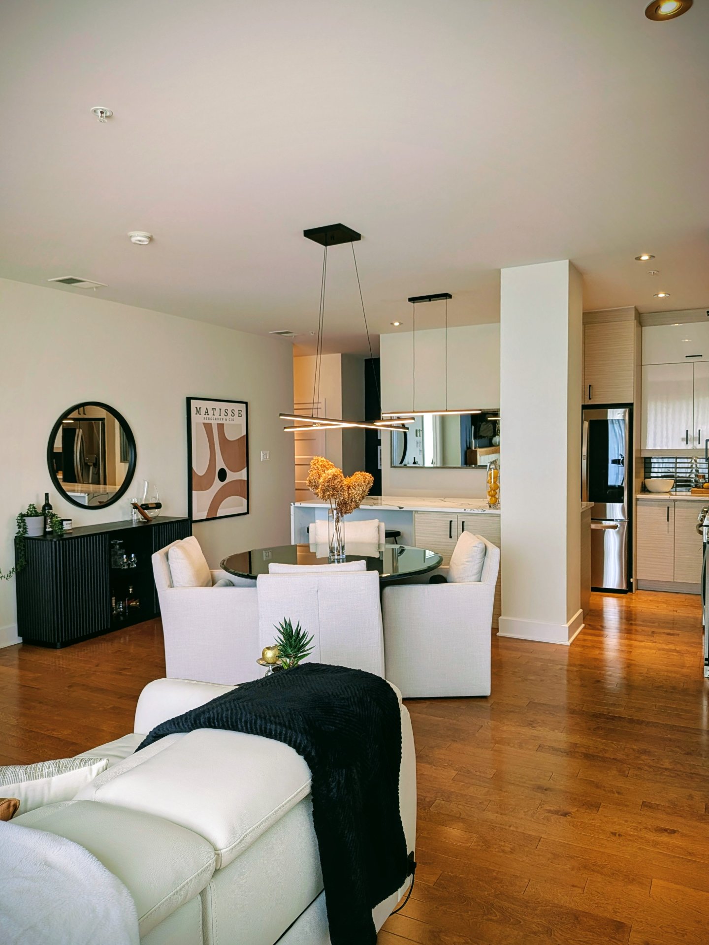 ouverte où la cuisine se distingue par ses armoires