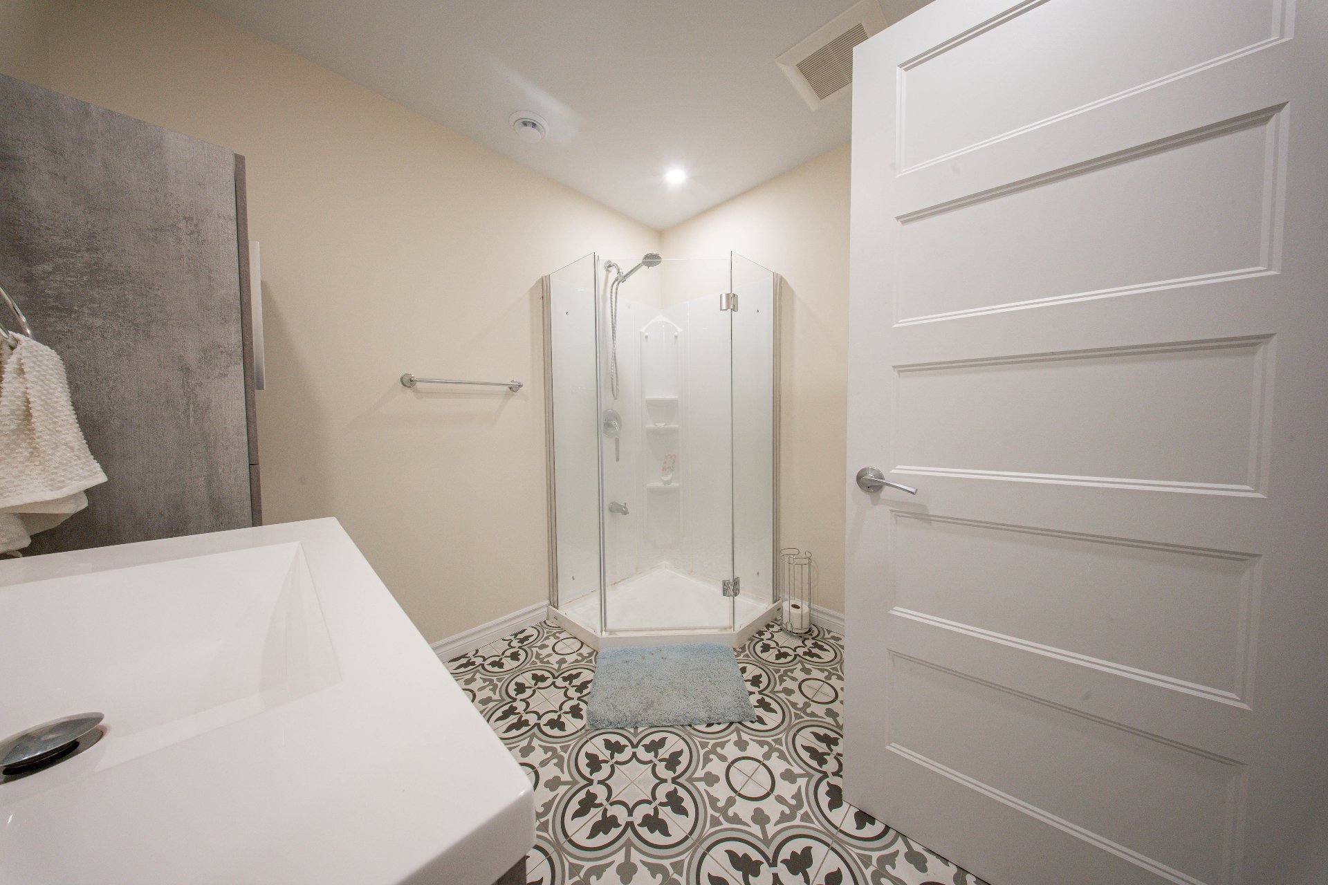 Spa et ses produits, stores et rideaux, commode de la salle de bain, micro-ondes avec hotte intégrée, parasol