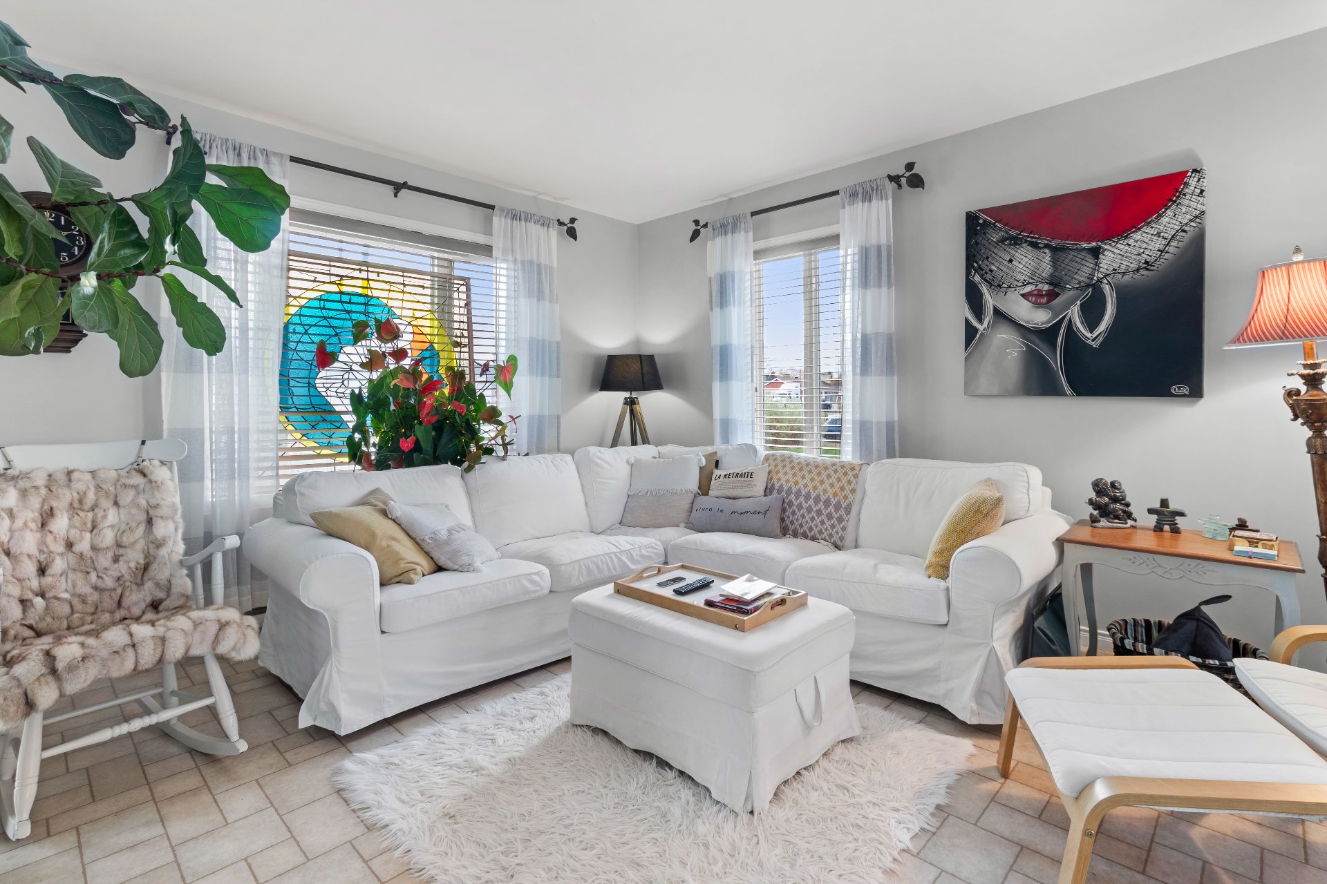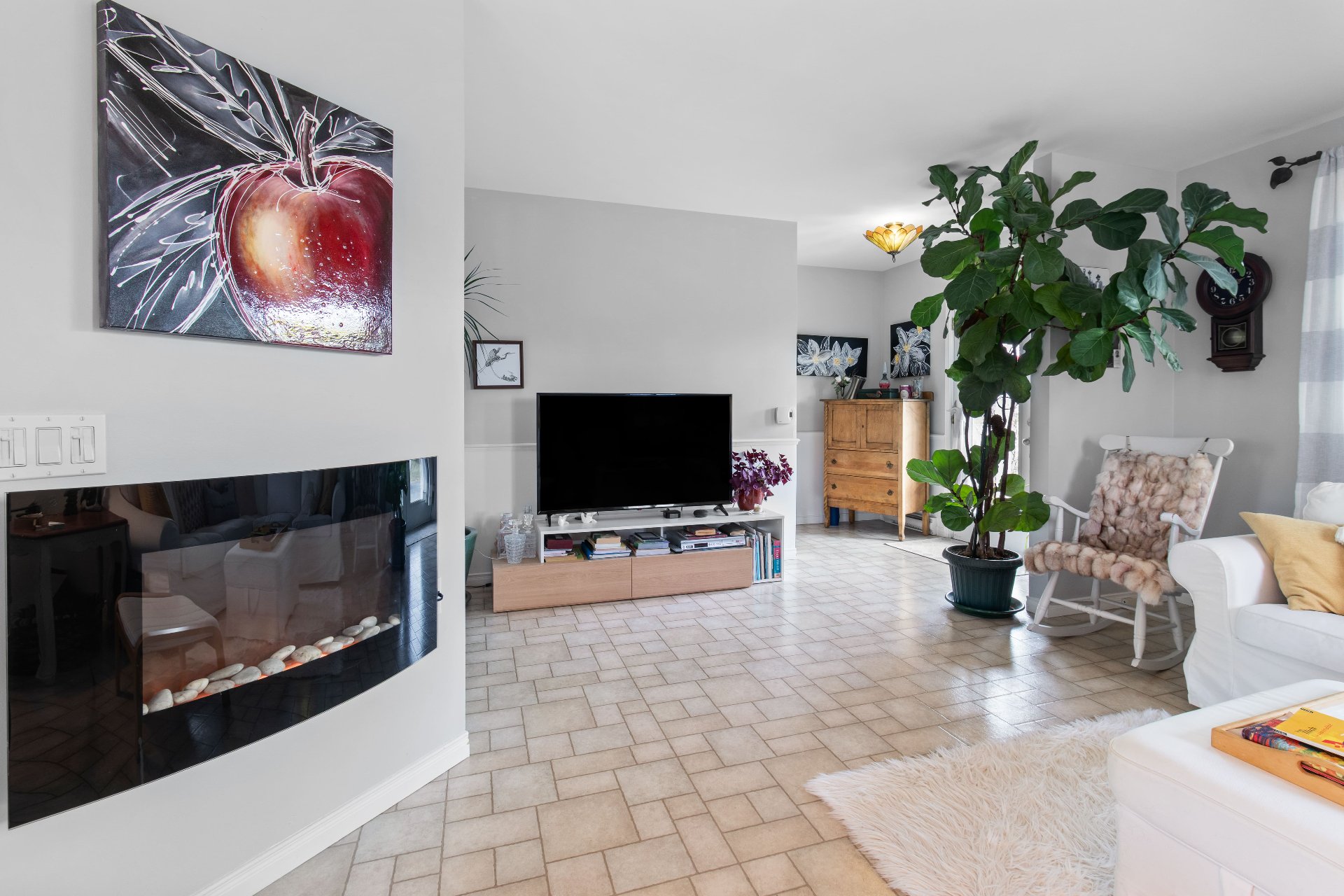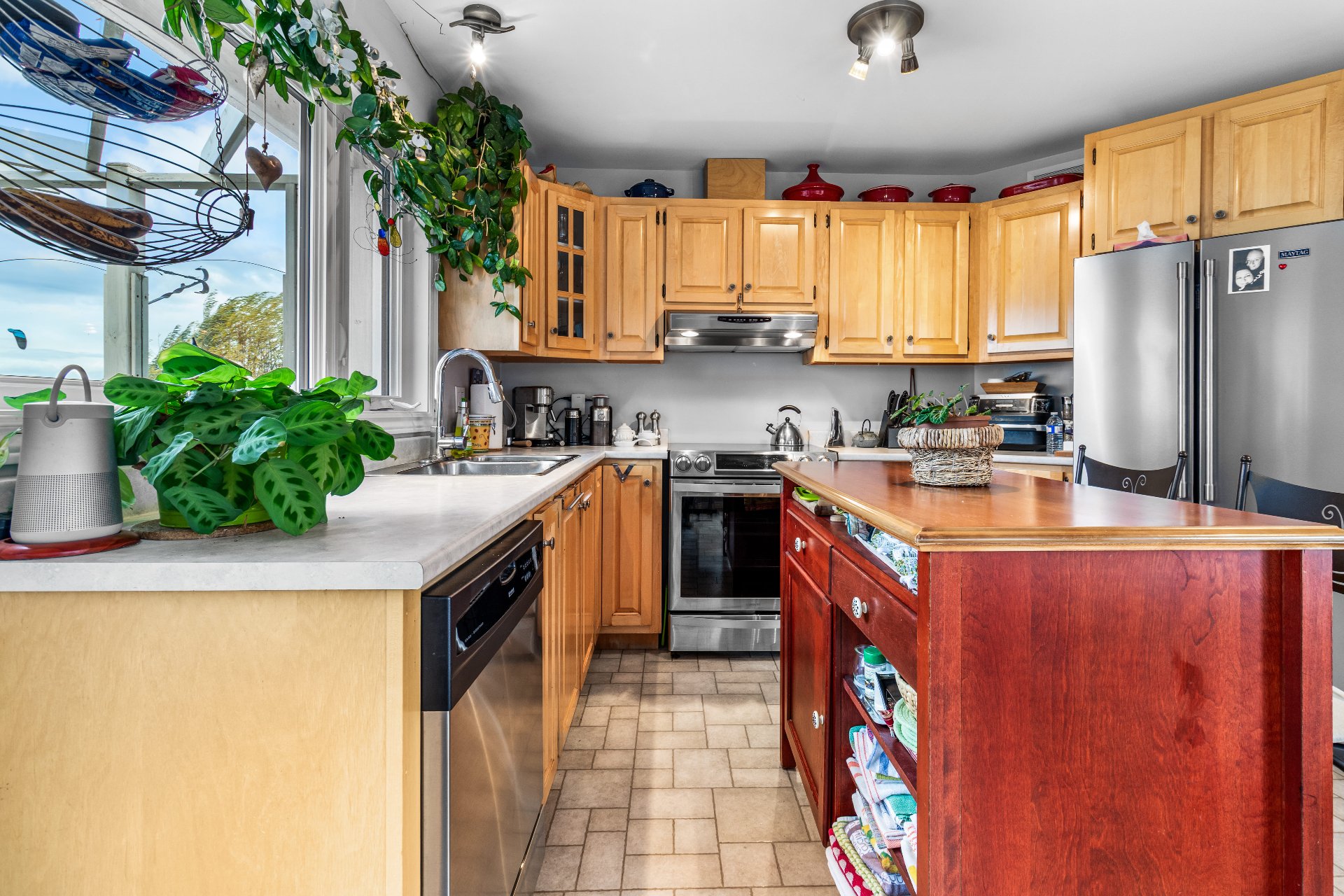 Meubles et effets personnels, îlot de cuisine, rideaux, luminaire entrée salon.