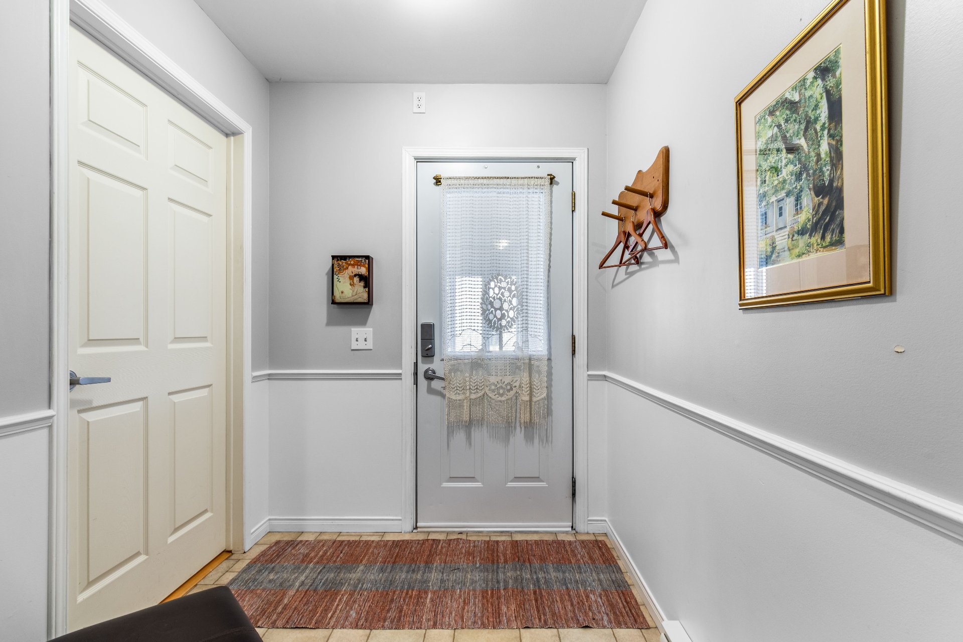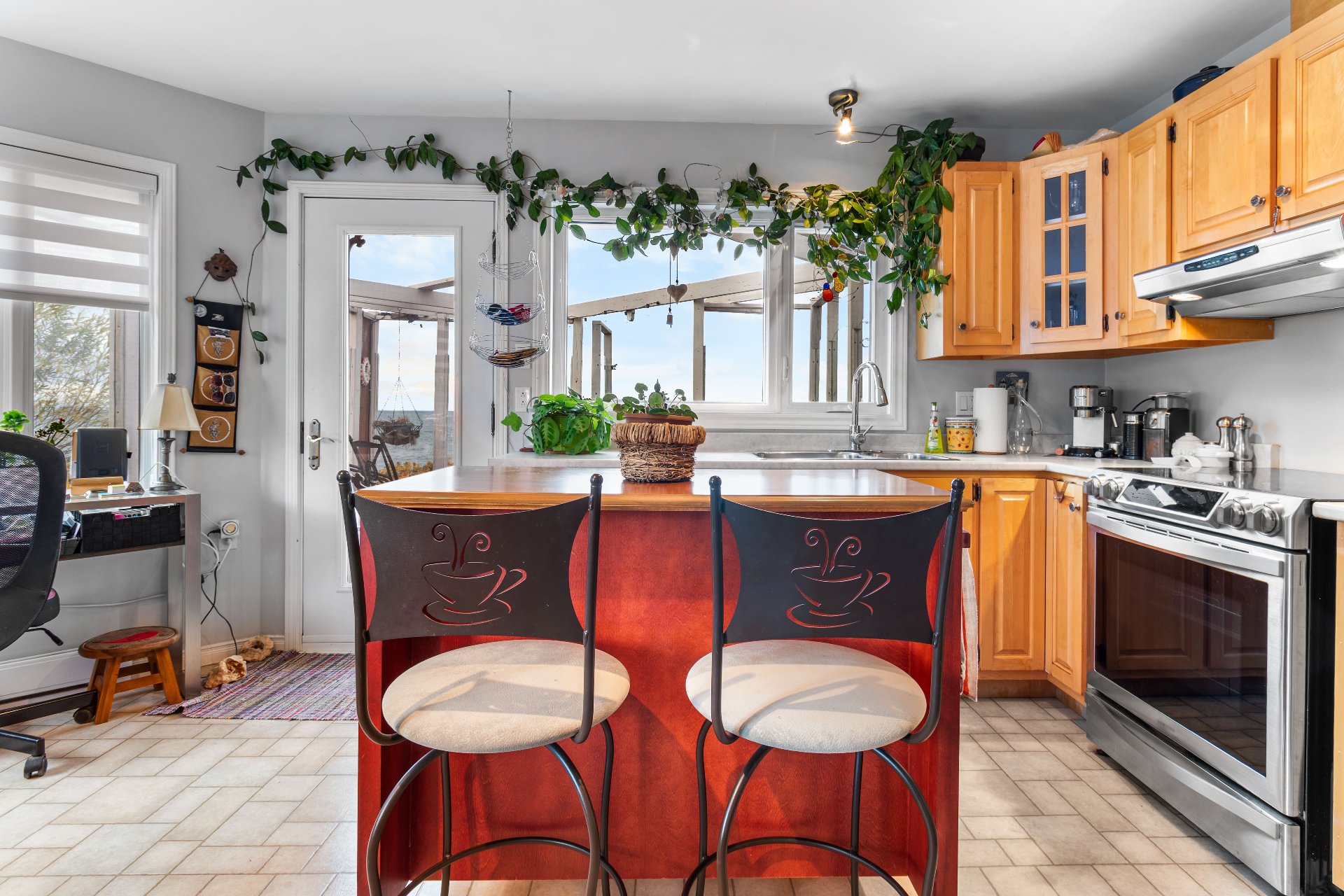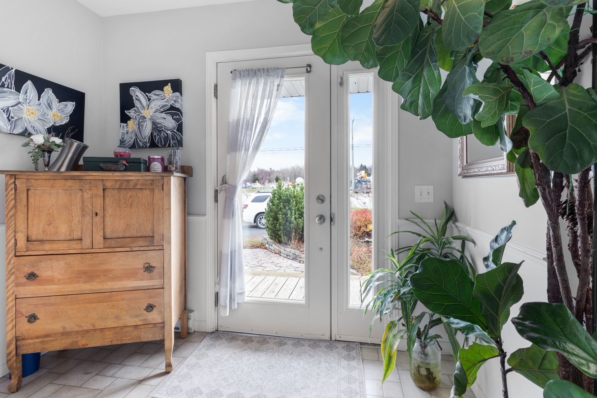 Meubles et effets personnels, îlot de cuisine, rideaux, luminaire entrée salon.