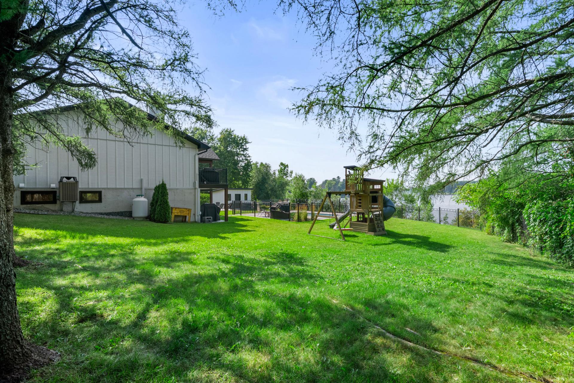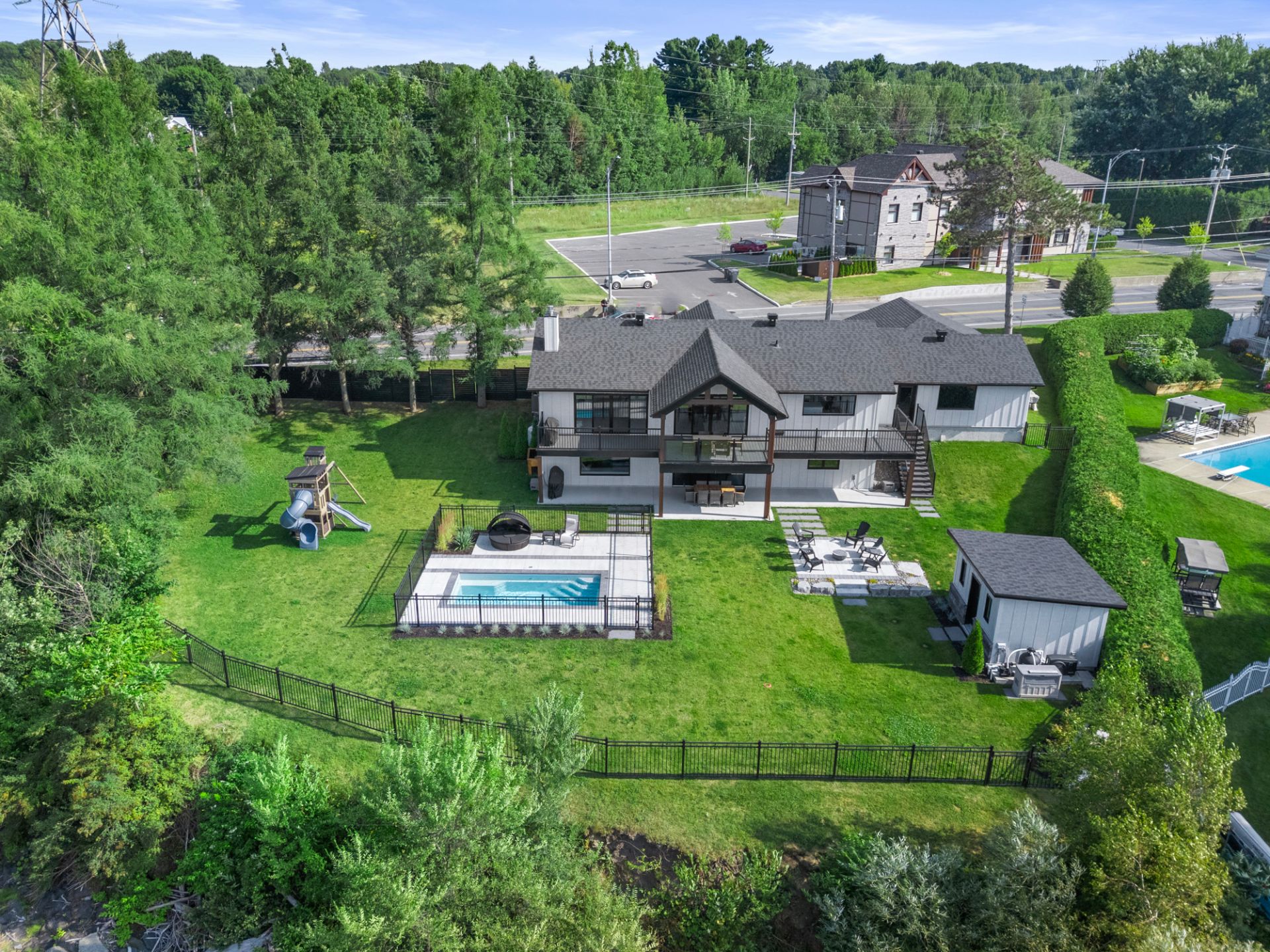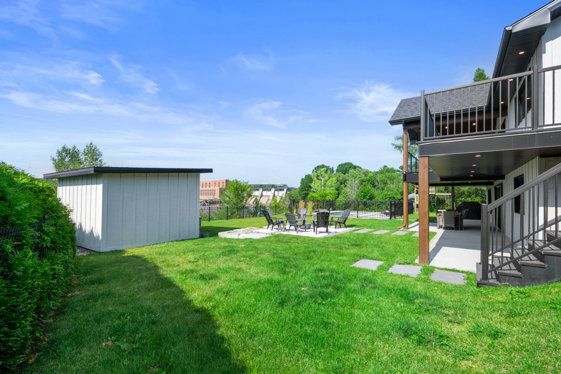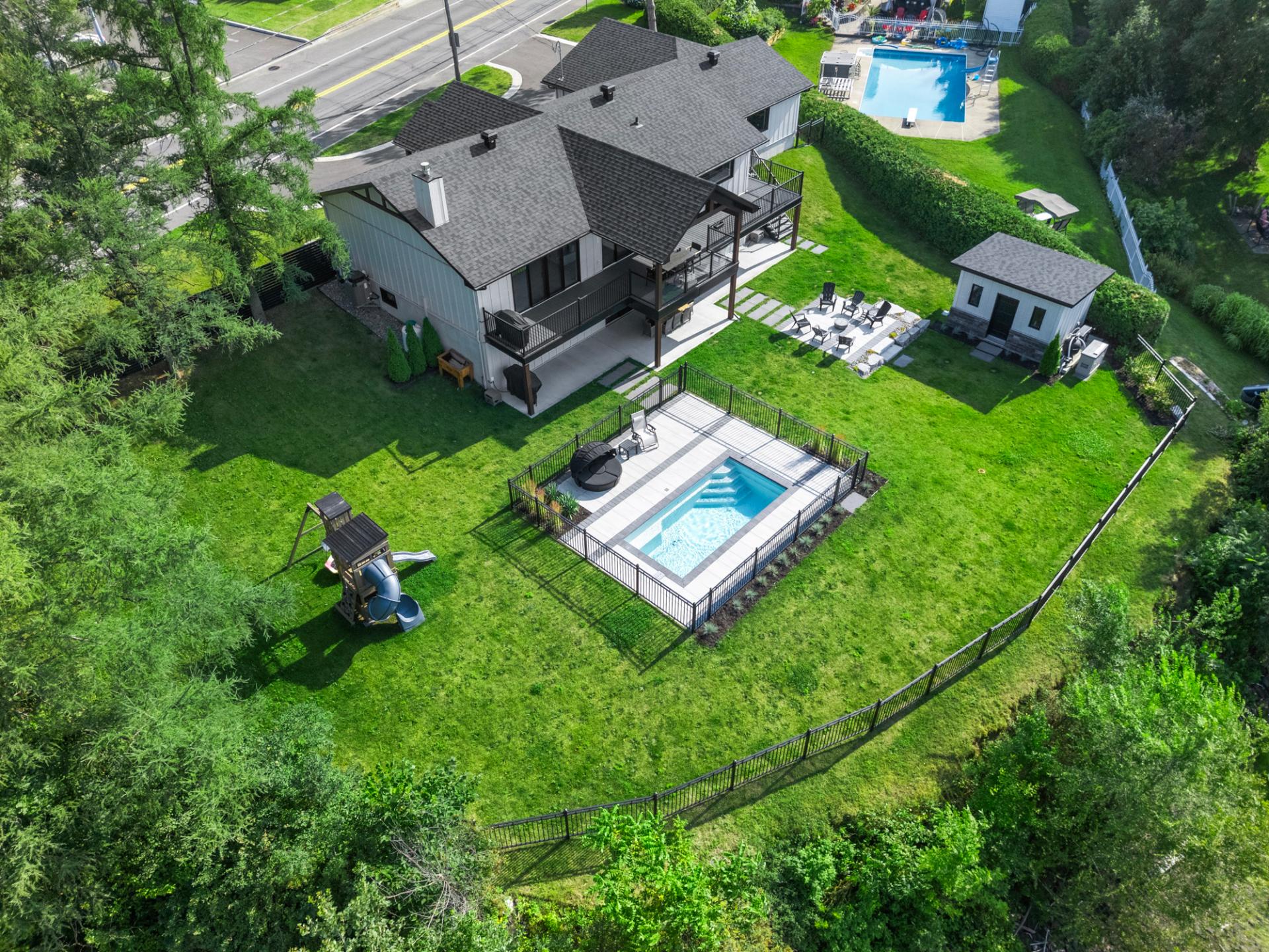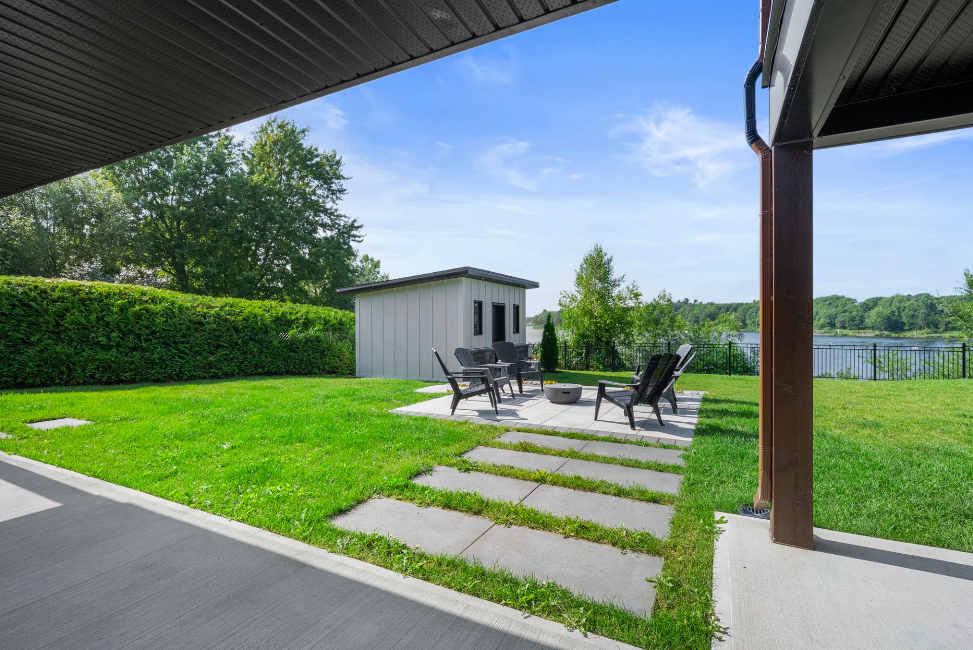 remise pratique et terrain entièrement paysagé. Le garage