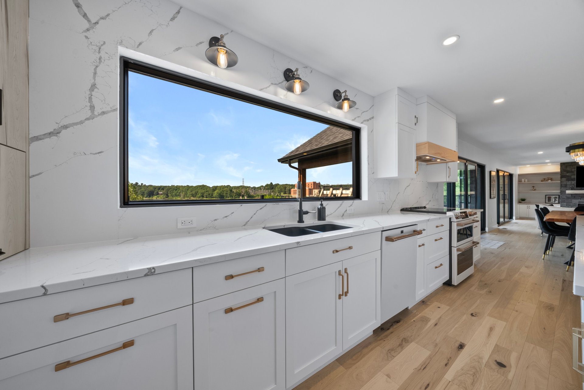 Électroménagers de cuisine GE Café (réfrigérateur, double four, lave-vaisselle), piscine et accessoires, stores et rideaux, support mural pour téléviseur.