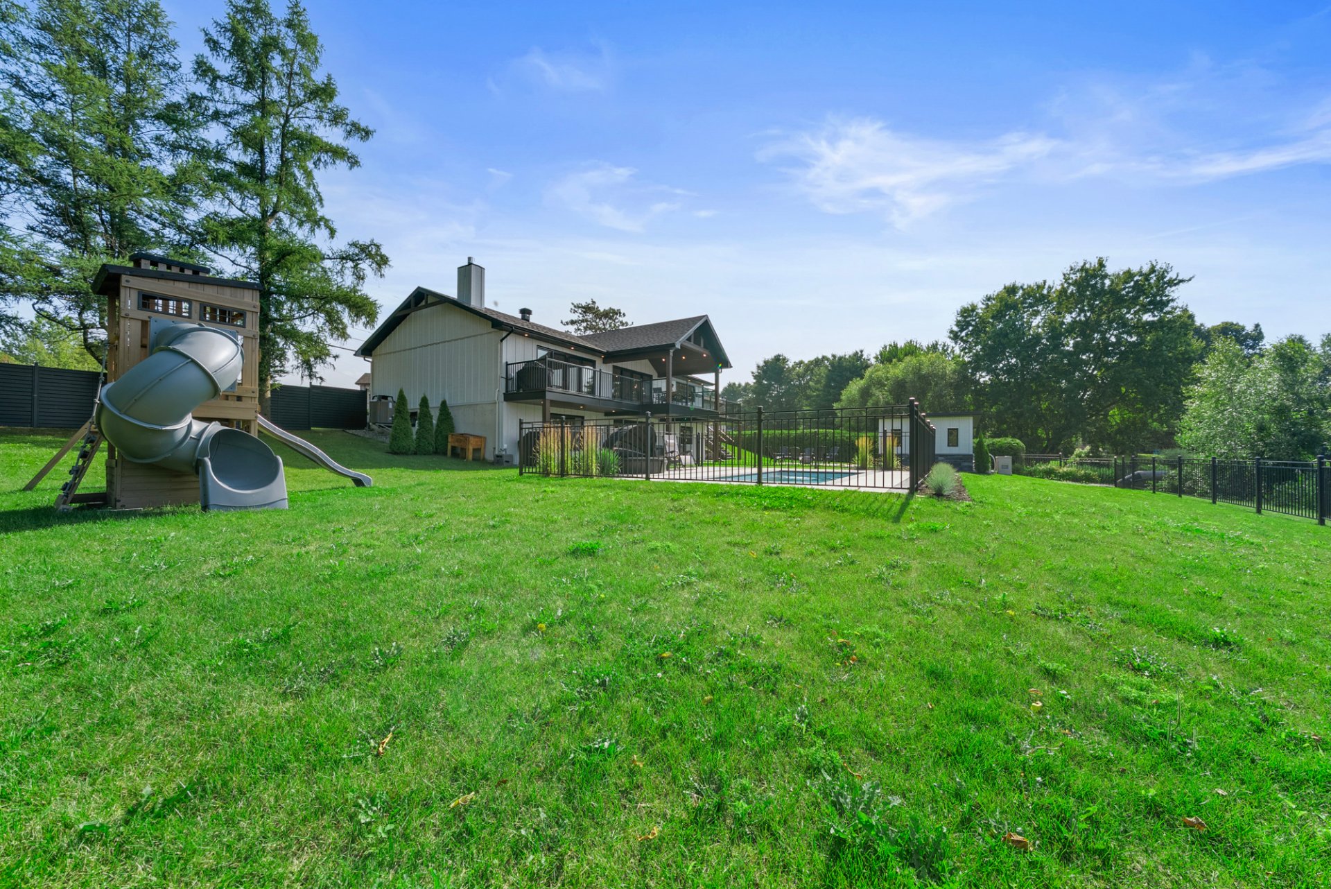 Micro-ondes, laveuse et sécheuse Samsung, téléviseurs, table de billard, module pour enfants, foyer extérieur et chaises, BBQ, meubles et effets personnels.